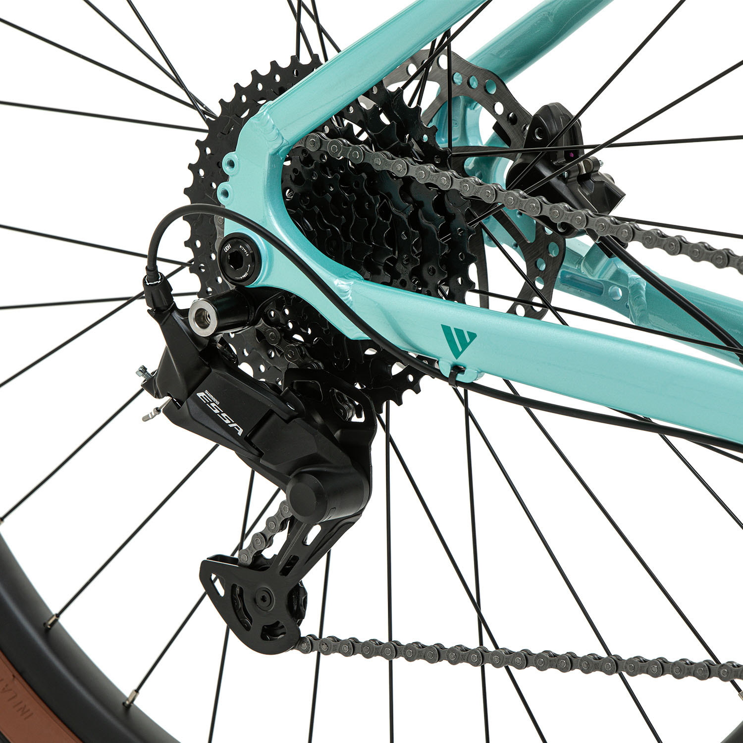 - Надежная 8-скоростная трансмиссия Shimano Еssa. Задний переключатель имеет низкопрофильную конструкцию, цепь не задевает перо рамы в сложных условиях езды, работает без шума.